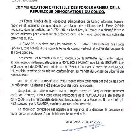 RDC : les Forces armées alertent sur le déploiement de 500 militaires au Nord Kivu par le Rwanda.