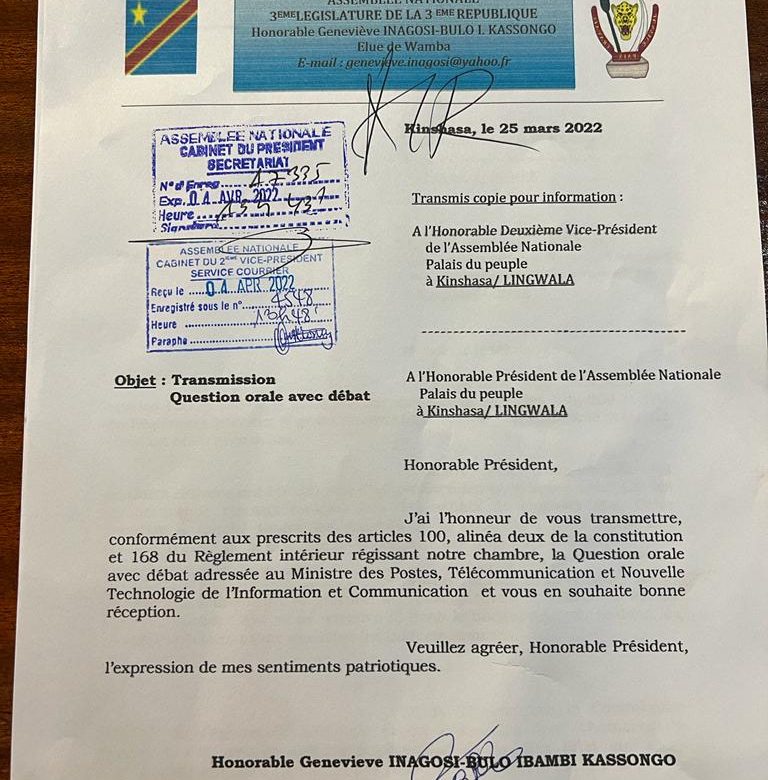 Selon elle, dans sa lettre adressée au président de l’Assemblée nationale, Christophe Mboso, c’est dans le souci d’obtenir du ministre Augustin Kibassa des éclaircissements sur les délais et modalités de remboursement des prélèvements de la taxe RAM, suspendue depuis le début du mois de mars dernier.