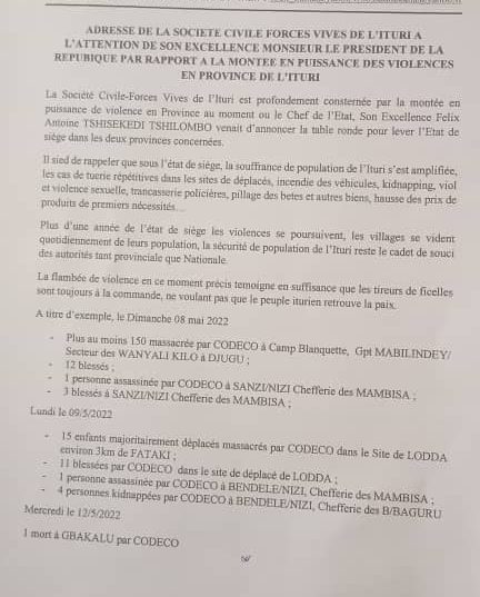 Ituri 13 mai 2022, dans une déclaration rendue publique le jeudi 12 mai, la société civile ,forces vives de l’Ituri sont profondément consternés par la montée en puissance des violences en province , au moment où le Président de la République Félix Antoine TSHISEKEDI TSHILOMBO venait d’annoncer la table ronde pour la levée de l’état de siège[…]