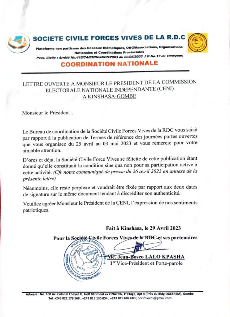 Dans sa lettre ouverte de ce samedi 29 avril 2023, la Société Civile Forces Vives de la RDC demande au Président de la CENI, Denis Kadima, des clarifications quant à l’authenticité de Termes de référence « fait à Kinshasa le 27 avril 2023 » mais signés « le 22 avril 2023. »