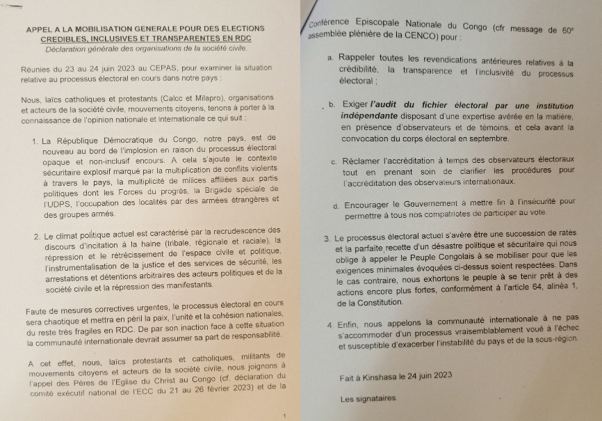 Dans une déclaration commune faite ce samedi 24 juin 2023 à Kinshasa, le CALCC, le MILAPRO, des acteurs de la société civile et des mouvements citoyens sont revenus sur les préalables pour éviter le chao électoral en République Démocratique du Congo.