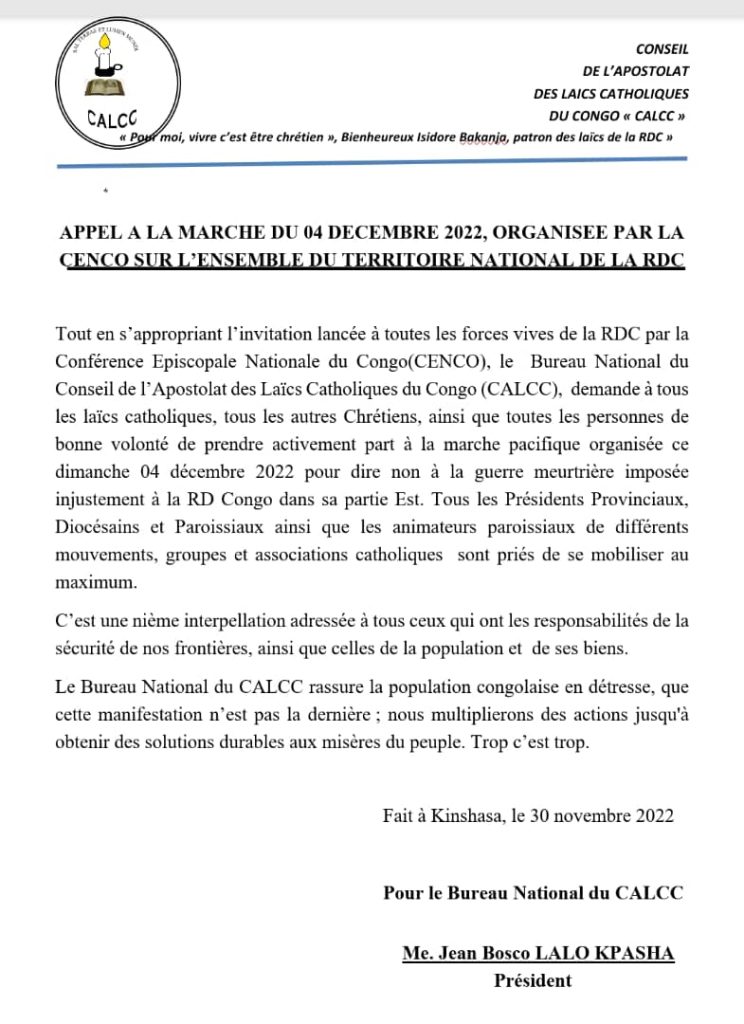 Dans son communiqué parvenu ce matin à notre rédaction, le Bureau National du Conseil de l’Apostolat des Laïcs Catholiques du Congo (CALCC), lance un vibrant appel à « tous les laïcs catholiques, tous les autres chrétiens, ainsi que toutes les personnes de bonne volonté de prendre activement part à la marche pacifique organisée ce dimanche 04 décembre 2022 pour dire non à la guerre meurtrière imposée injustement à la Rd. Congo dans sa partie Est ».