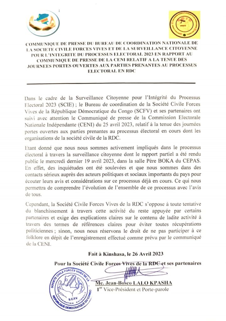 « La Société Civile Forces Vives de la RDC s’oppose à toute tentative du blanchissement à travers cette activité du reste appuyée par certains partenaires et exige des explications claires sur le contenu de ladite activité à travers des termes de références claires pour éviter toutes récupérations politiciennes », indique le communiqué de presse de la Société Civile Forces Vives et de la Surveillance Citoyenne pour l’Intégrité du Processus Électoral de ce mercredi 26 avril 2023.