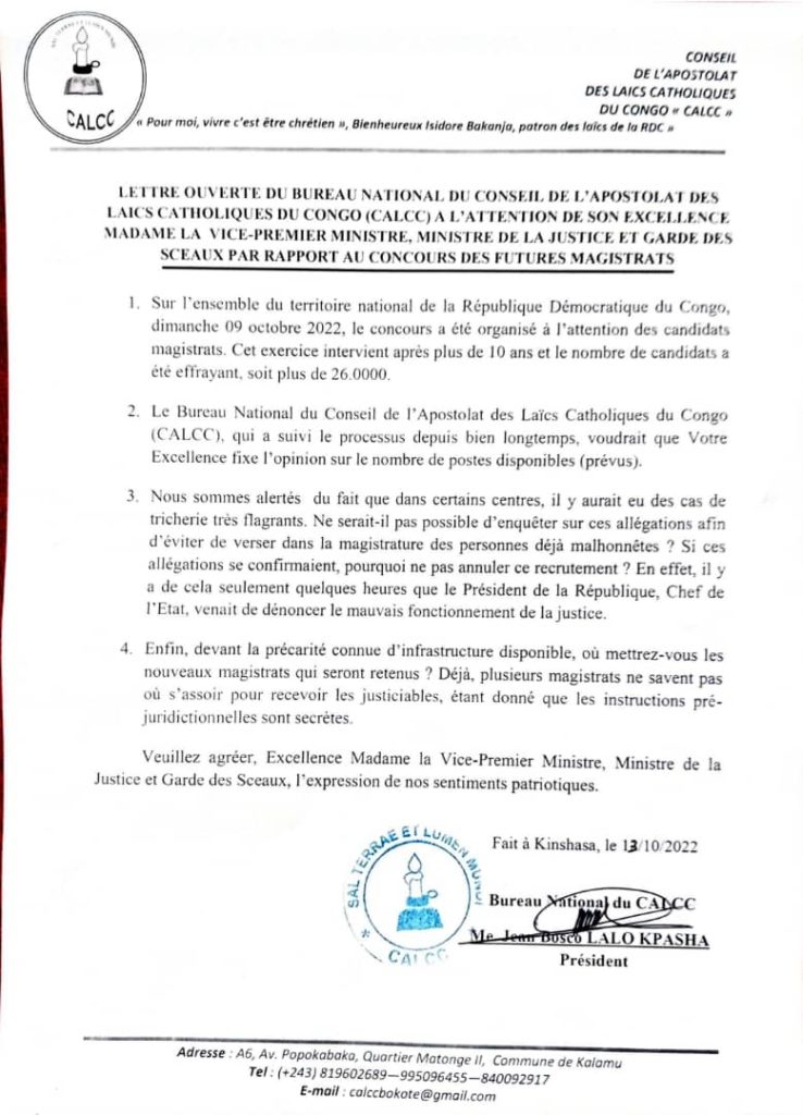 Dans une lettre ouverte parvenue ce 13 octobre 2022 à la Rédaction du média leslaicsdanslemonde.net, le Conseil de l’Apostolat des Laïcs Catholiques du Congo (CALCC), appelle la Vice-premier Ministre, Ministre de la Justice et Garde des Sceaux à annuler le recrutement des nouveaux magistrats, faisant échos des tricheries dans certains centres lors du concours lancé par l’Etat.